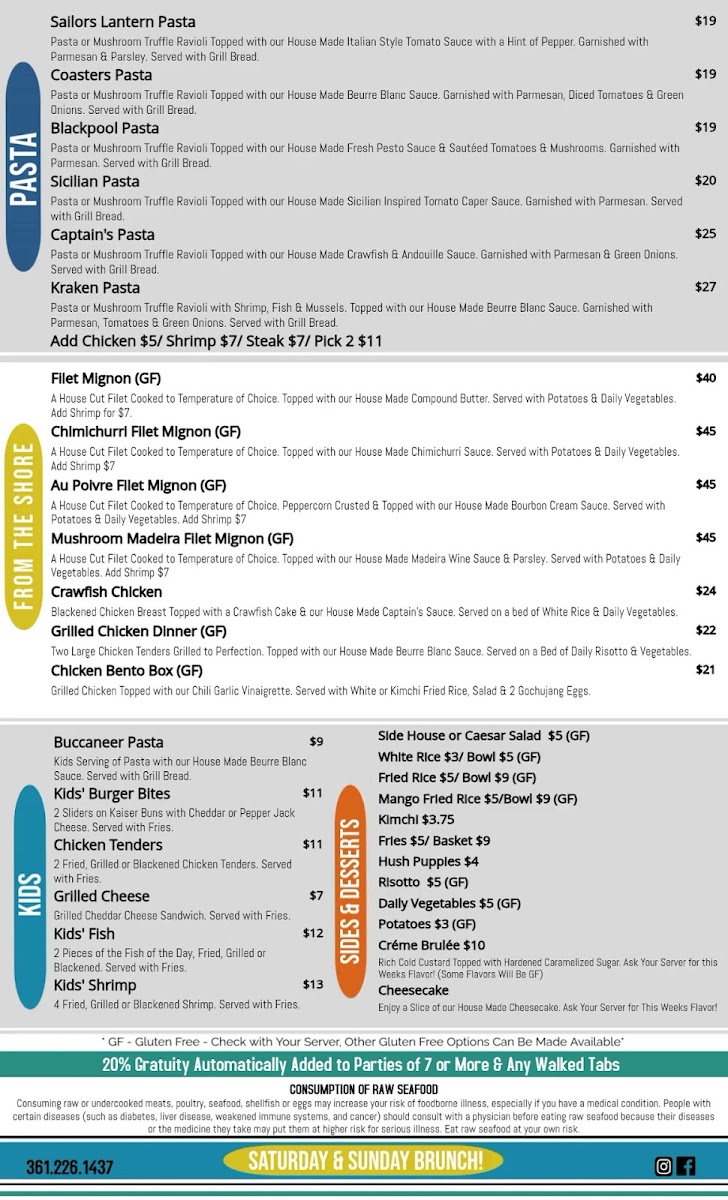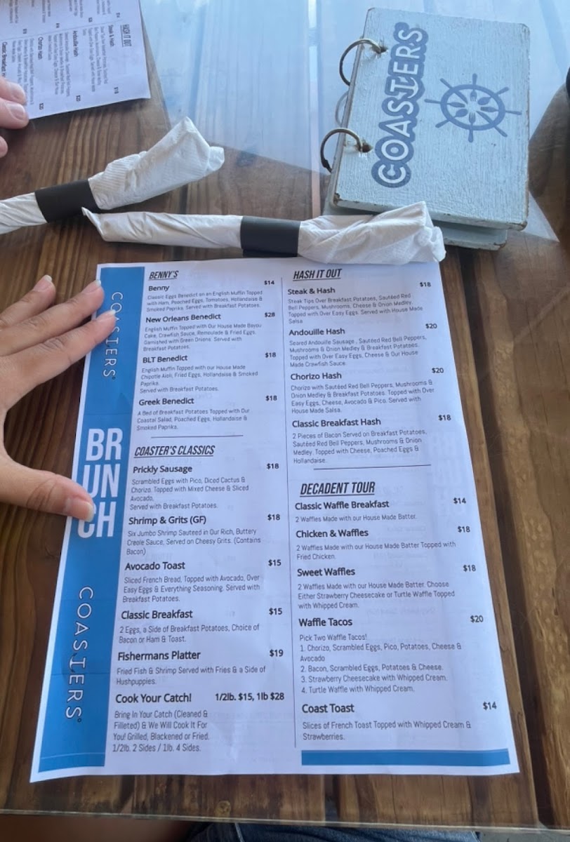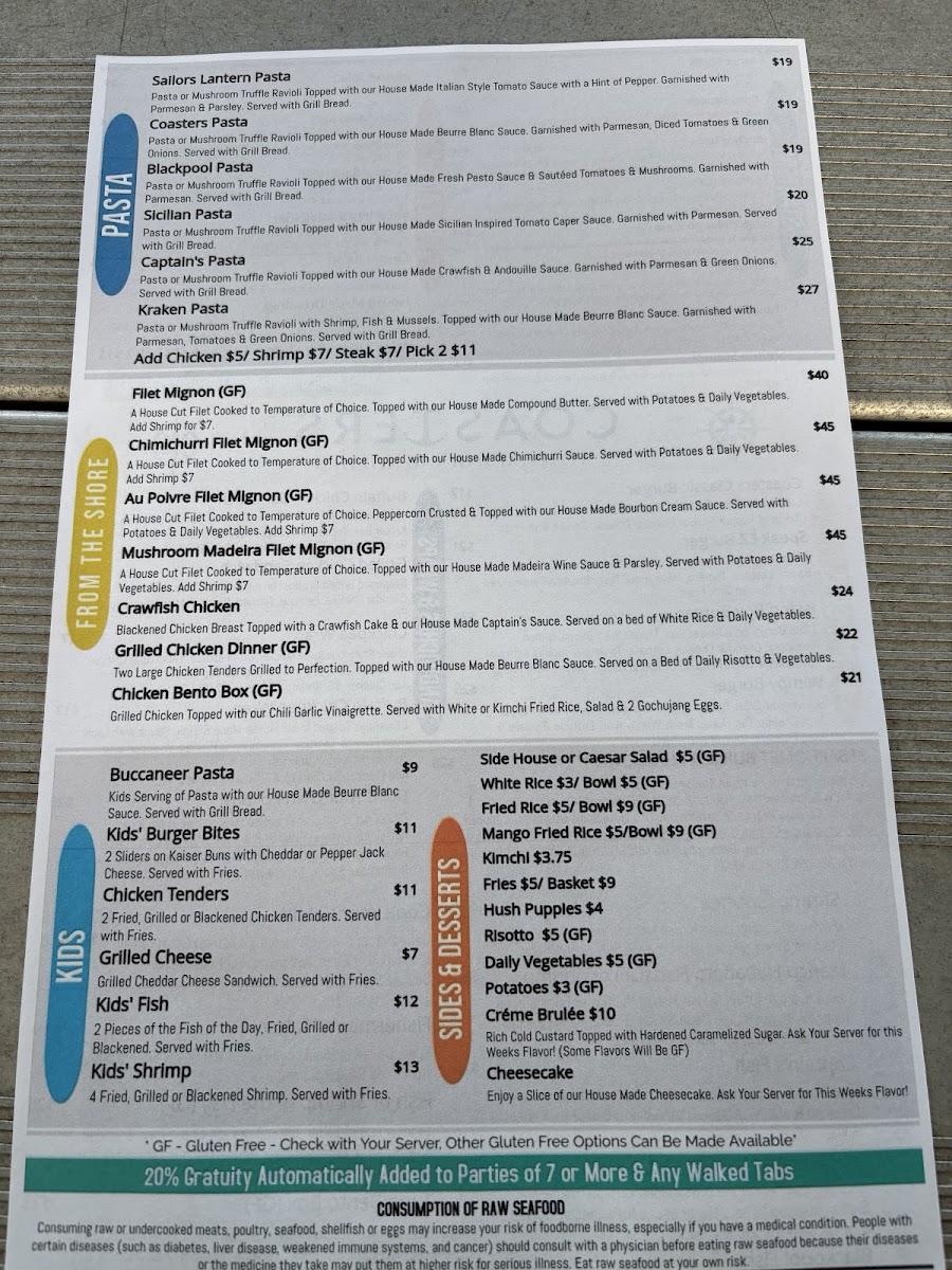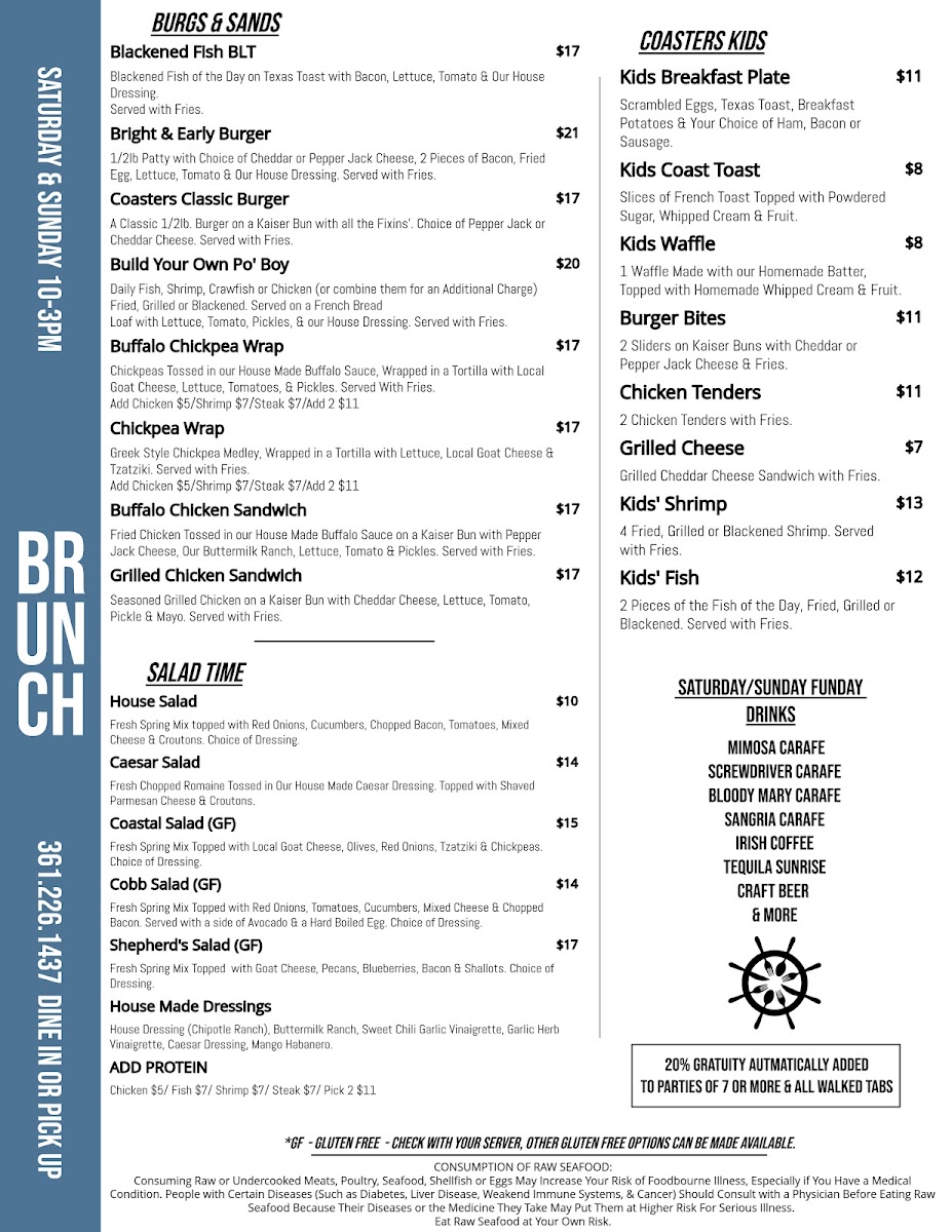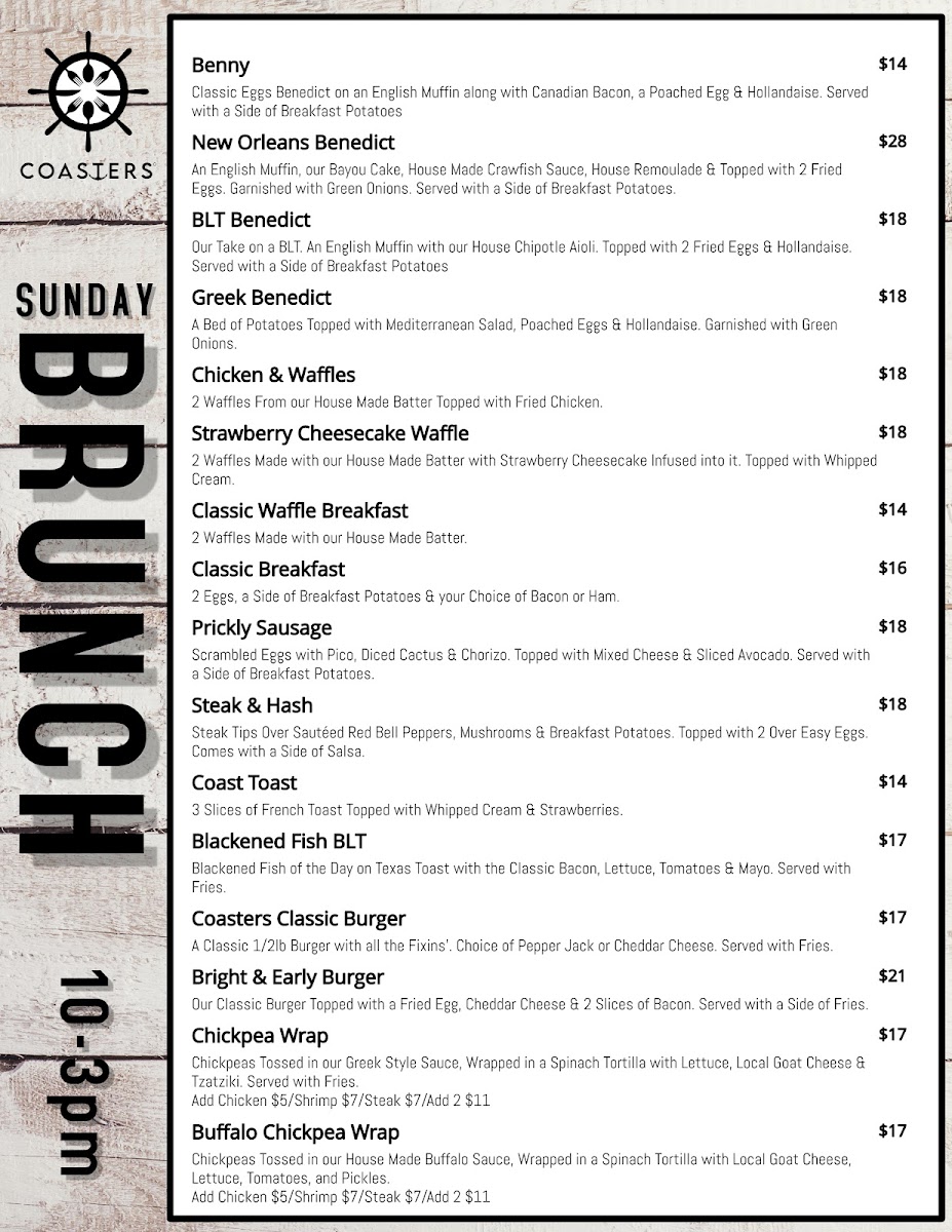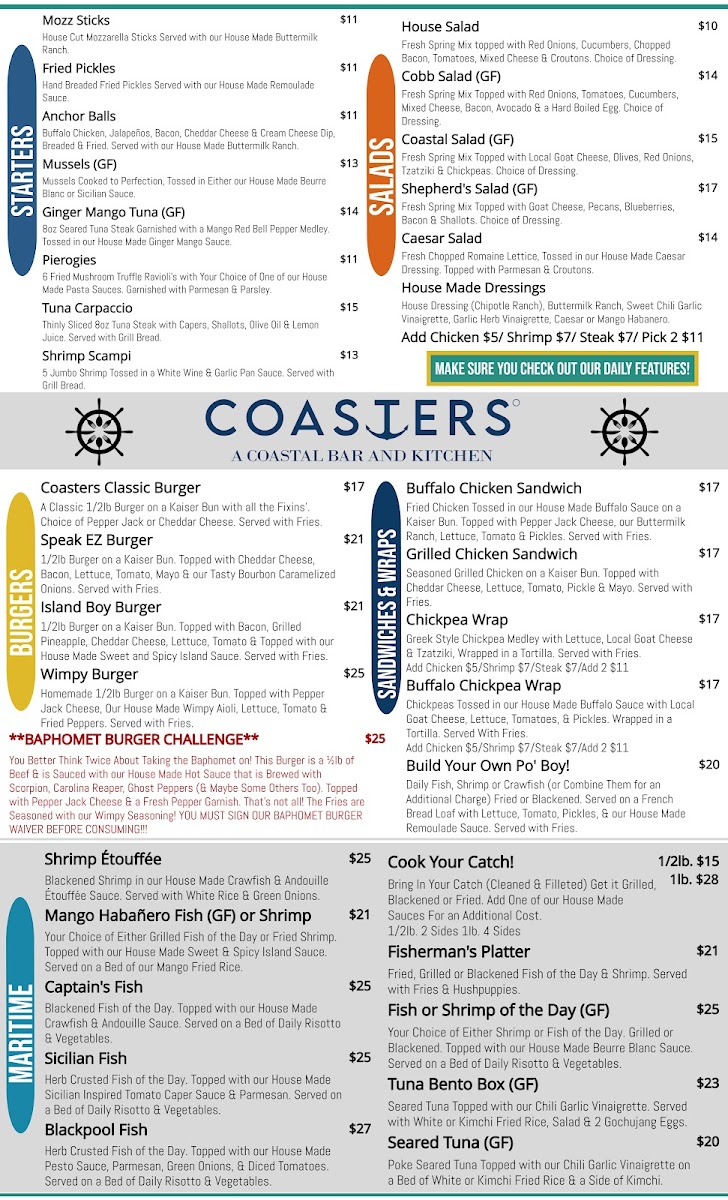Start with shareable hors d'oeuvres like Capers Calamari or the delicate Lox Roulade, ideal for opening the appetite. Burgers, such as the signature Coasters Classic or the spicy Buffalo Chicken Sandwich, provide casual yet satisfying choices for a midday bite. For something with a bit more depth, the pasta dishes and fresh catch options — including preparations like Mango Habañero Fish or Shrimp Étouffée — offer comfort with a coastal twist.