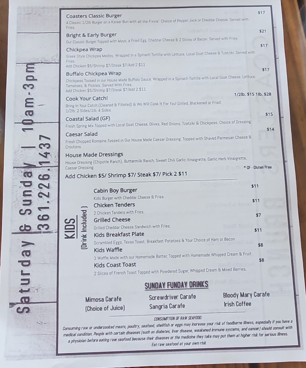 Coasters offers a menu that strikes a balance between approachable coastal fare and casual comfort. The selection leans into fresh seafood classics alongside hearty burgers and satisfying pastas, creating a relaxed dining experience perfect for any part of the day.